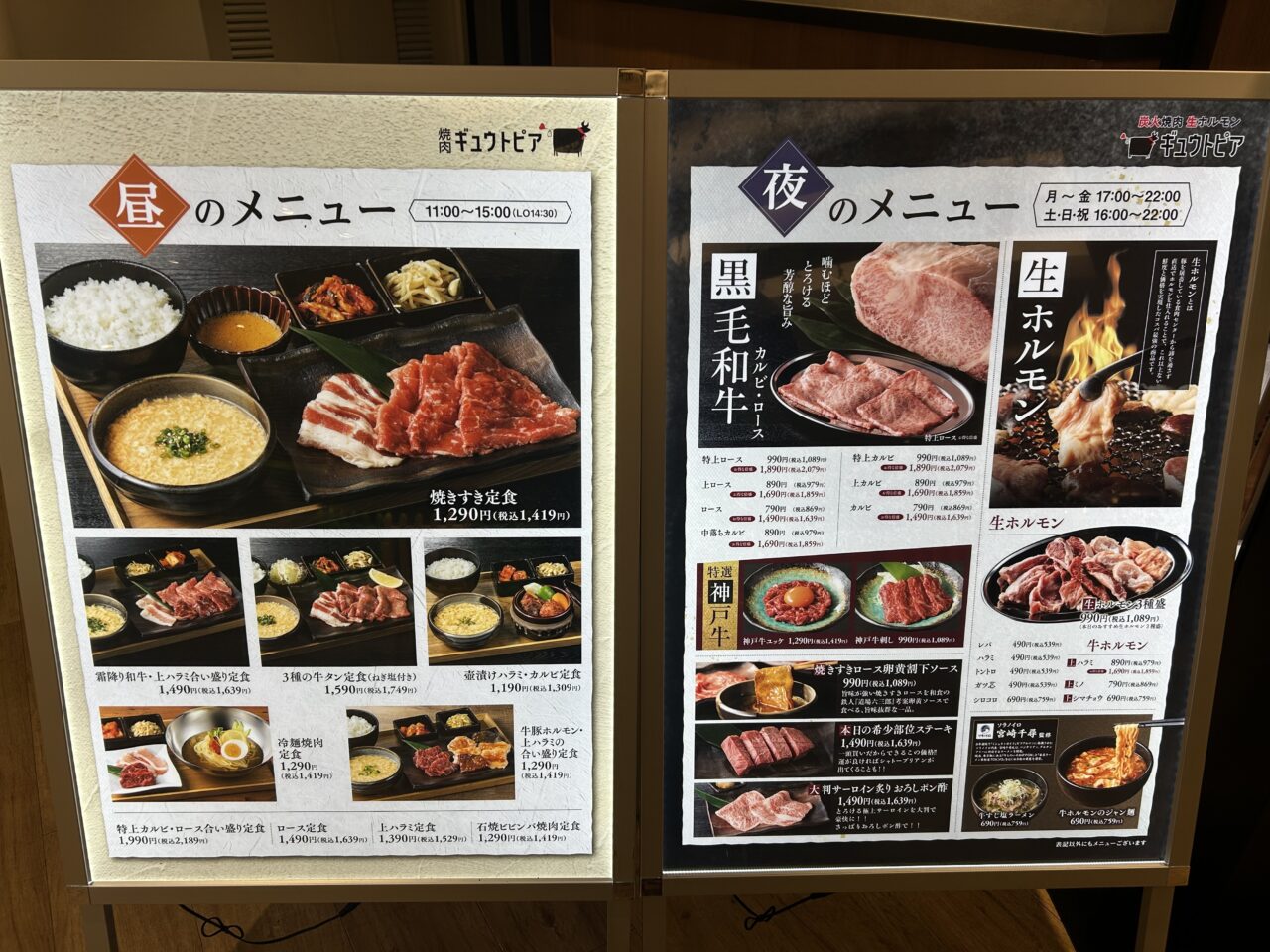 お店の入り口には昼・夜メニューの看板がありました。お店では炭火の焼肉を提供、希少部位のステーキではシャトーブリアンが出ることもあるそうです!