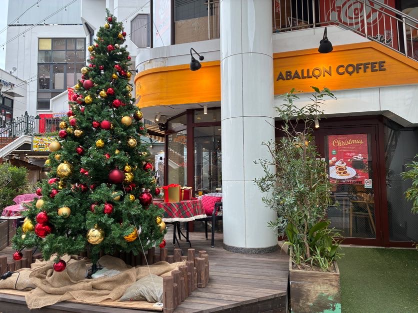 「akafoo park」の北館1階にある「アバロンコーヒー」。上大岡駅からも近く、多くの人が通る通りに面していますが、季節限定で大きなクリスマスツリーが登場!お店に近づくだけで、すでにクリスマスムード満載です♪