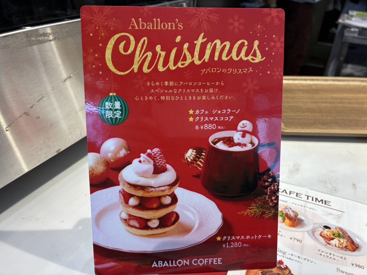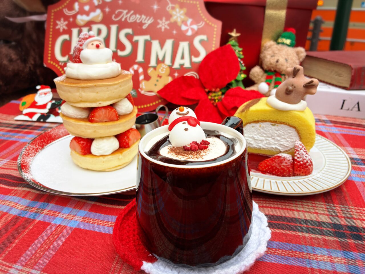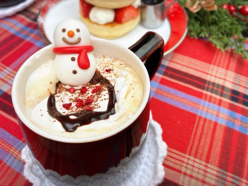 そして注文をすべく、まずは店内に!早速、クリスマス限定メニューの案内を発見。ちょこんと座ったサンタの姿が可愛らしい「クリスマスホットケーキ」。ドリンクメニューの「カフェ ショコラーノ」や「クリスマスココア」にはスノーマンのマシュマロがトッピング!