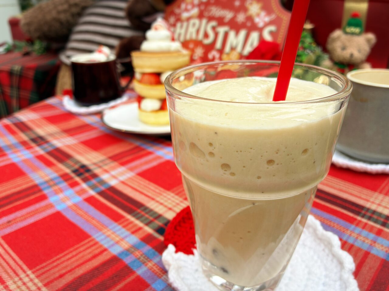 スノーマンのマシュマロがとにかく可愛い「カフェ ショコラーノ」。ホイップクリームにチョコソース、仕上げにフランボワーズのフレークがトッピング。甘いホイップとチョコソースに、フランボワーズのフレークの甘酸っぱさが良いアクセントに。ドリンク部分は、甘くないコーヒーなので、甘すぎないのがまた最高。見た目も華やかで、クリスマスらしさを感じる一杯でした。
