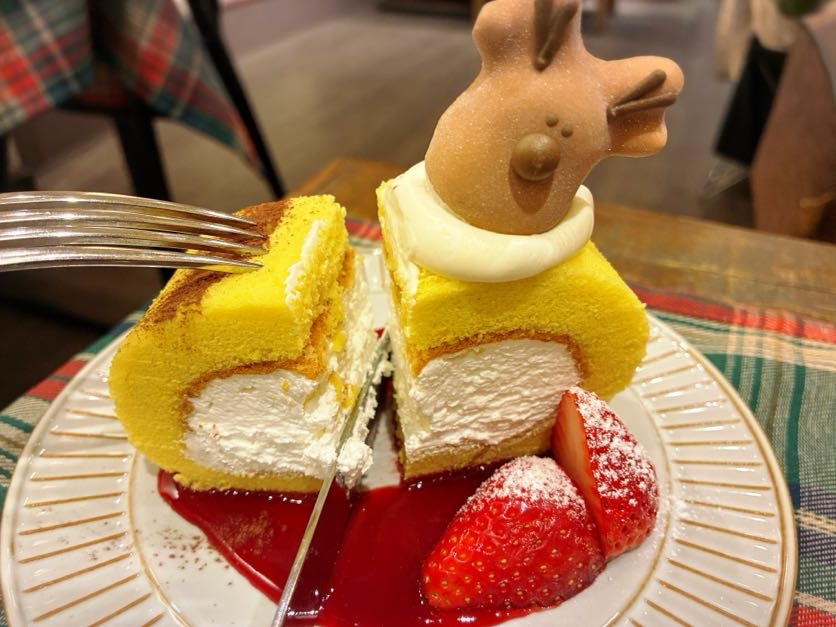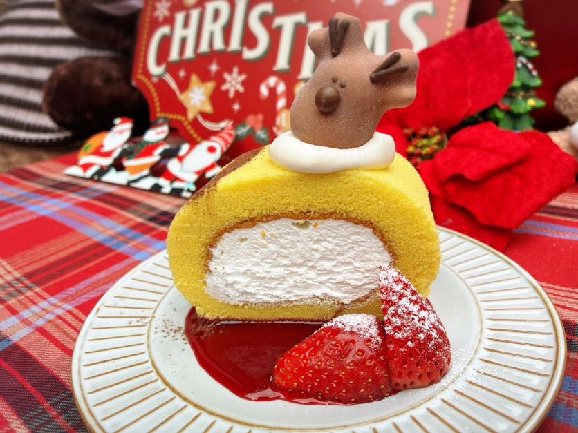 新登場の「トナカイロールケーキ」は、ふわふわ生地のロールケーキにホイップクリームがたっぷり。フランボワーズのソースや苺も添えられていてとってもお洒落です!