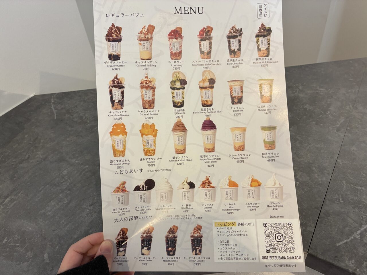 メニュー表には、思わず目移りしてしまうほど美味しそうなパフェがずらり!通常メニューは全18種類と豊富なラインナップです。さらに、「こどもあいす」は8種類用意されており、※こちらは大人も注文可能。加えて、アルコールを使用した**「大人のほろ酔いパフェ」も全4種類が揃っています。そのほかにも、毎月2品ずつの期間限定商品が登場予定とのこと。今後は、アイスパフェやドリンクメニューの展開も予定されているそうで、ますます目が離せません!