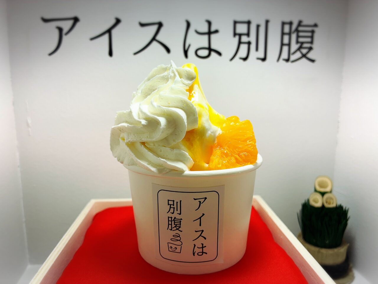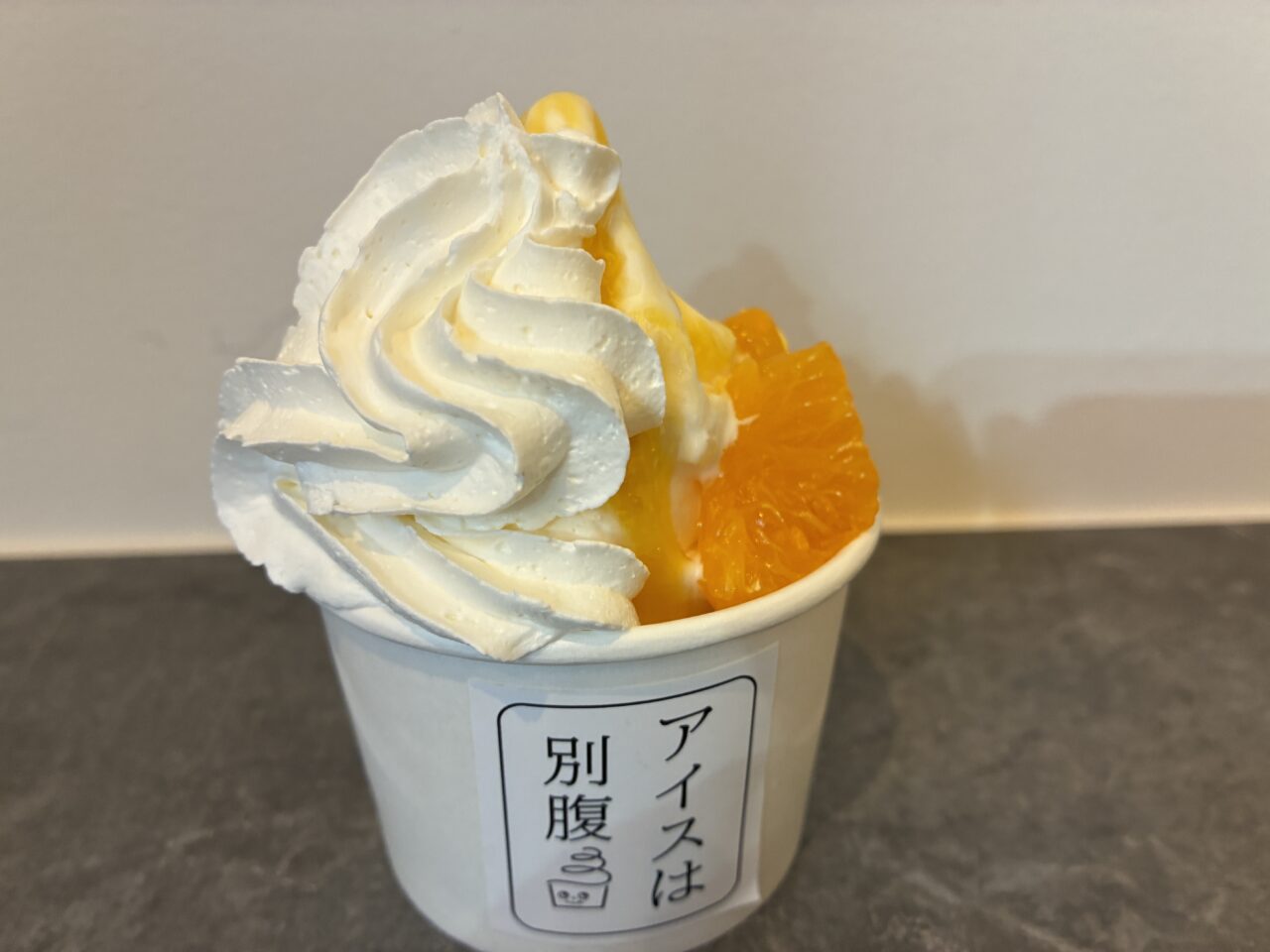 「ミニみかん」は、ソフトクリームの上に果肉たっぷりのみかんソースをかけ、正面左側にホイップクリーム・右側にみかんの盛り付けが!
