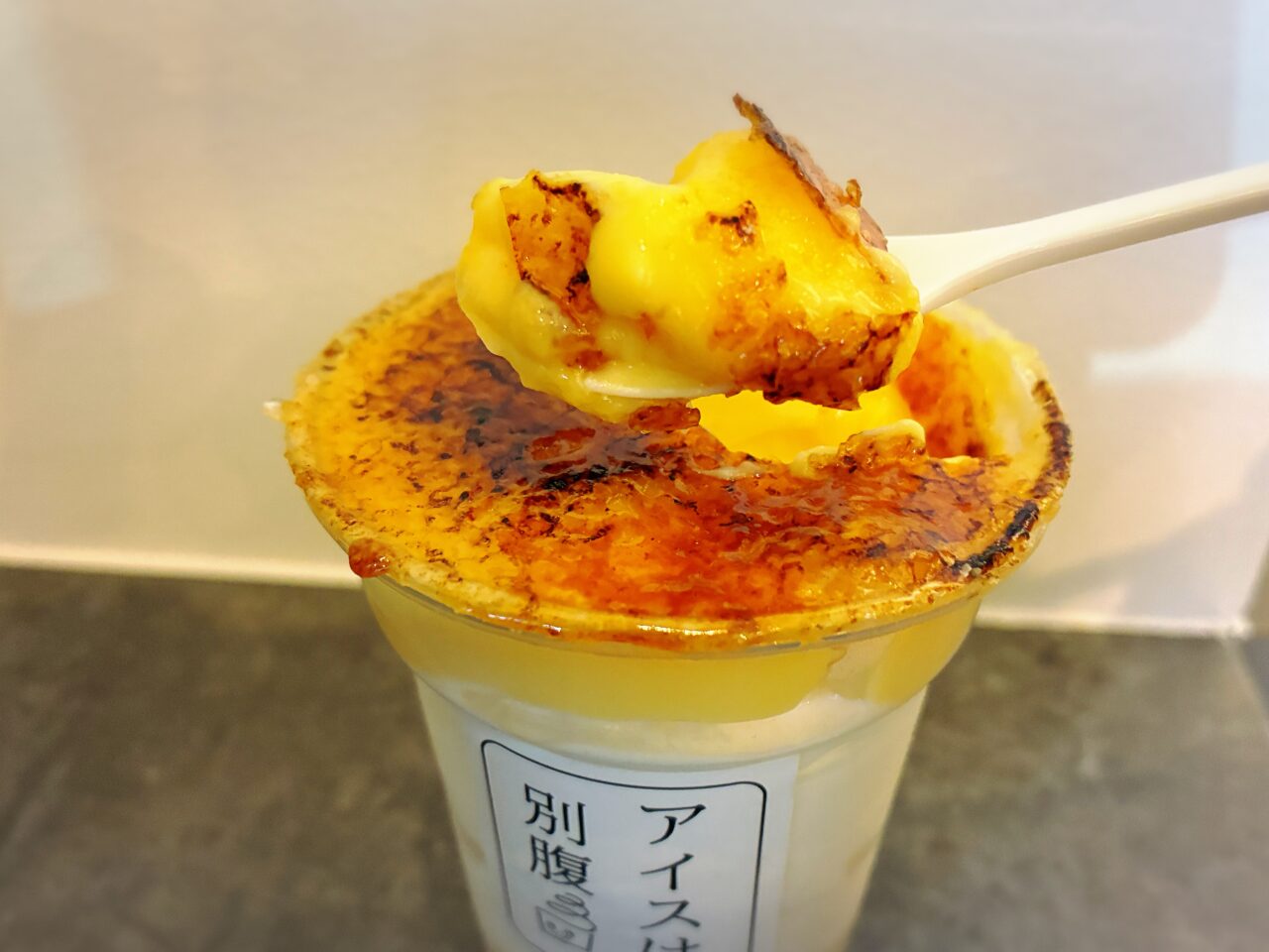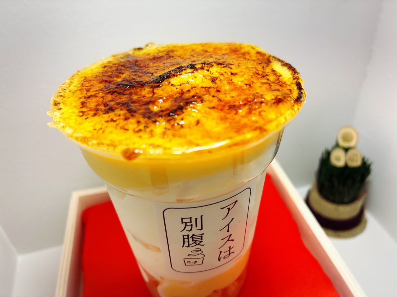 下にも上にもカスタードクリームがたっぷり入っていて、最後まで贅沢な味わい。カリッとしたキャラメリゼの食感と、トロッと濃厚なカスタードのなめらかさ、その対比が楽しめるのも大きな魅力です。香ばしいブリュレのやさしい甘さが口いっぱいに広がり、まさにご褒美感たっぷりのパフェ。中にはひんやりとしたソフトクリームとザクザク食感のコーンフレークも入っていて、食べ進めるほどに楽しさが増し、あっという間に完食でした。