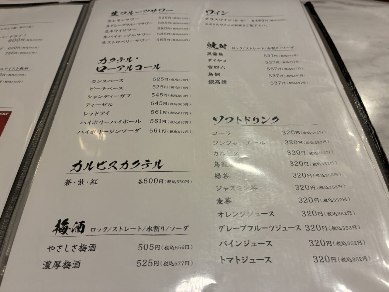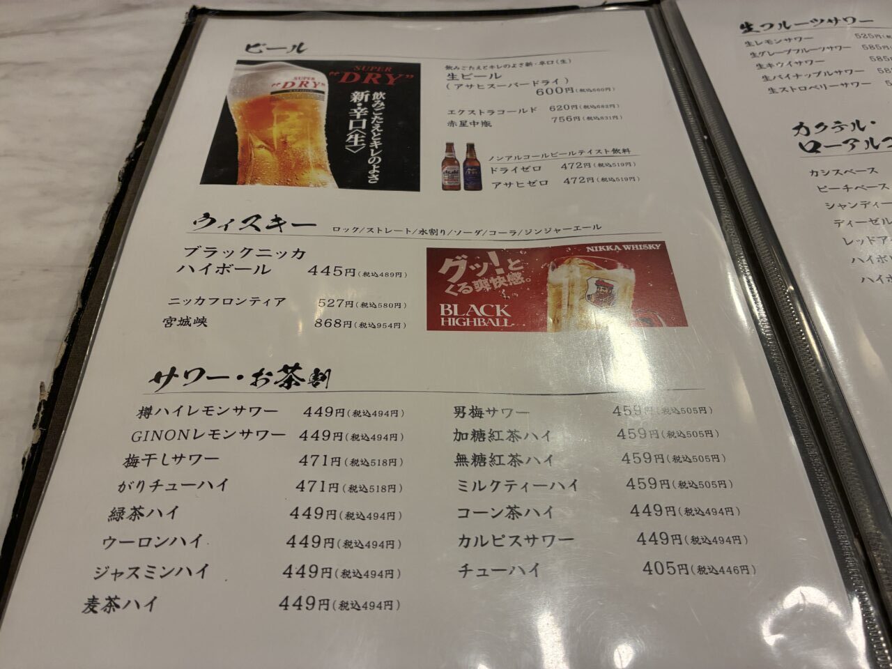 早速ドリンクメニューからご紹介したいと思います!生ビールには限られた認定店のみで提供されるアサヒビールの「スーパードライ エクストラコールド」の文字が!ウィスキーやサワー・お茶割類も種類豊富。価格がリーズナブルなのもポイントです♪