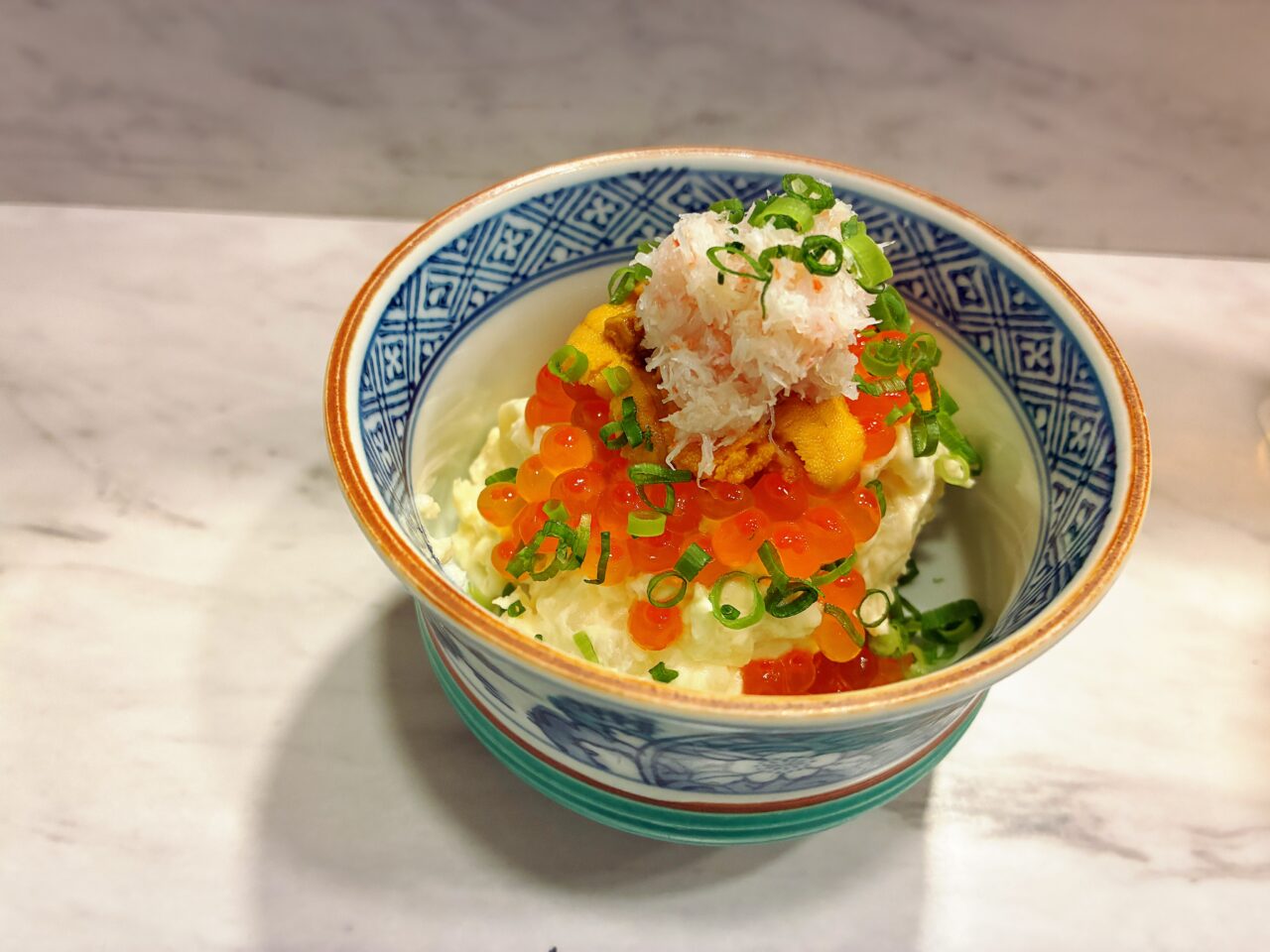 クリーミーなポテトに蟹の旨みが重なり、いくらのプチプチ感とうにのコクがアクセントに。見た目以上にバランスが良く、蟹と雲丹の濃厚な旨みが広がります。いくらの食感も心地よく、お酒が進む贅沢なポテトサラダでした。