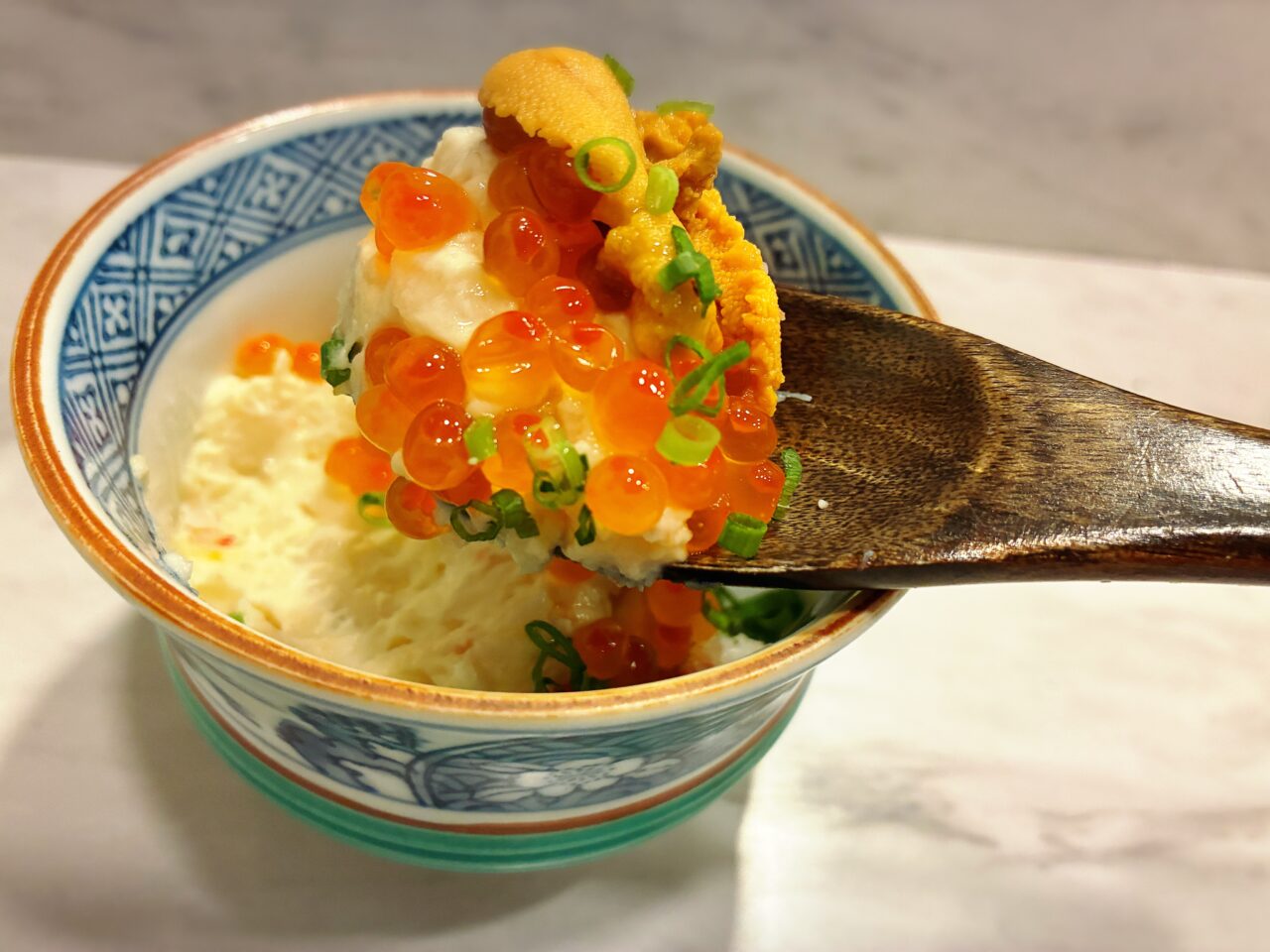 今回は、名前のインパクトに惹かれて「痛風ポテサラ」を注文。蟹・いくら・雲丹という、なんとも豪華な組み合わせ。