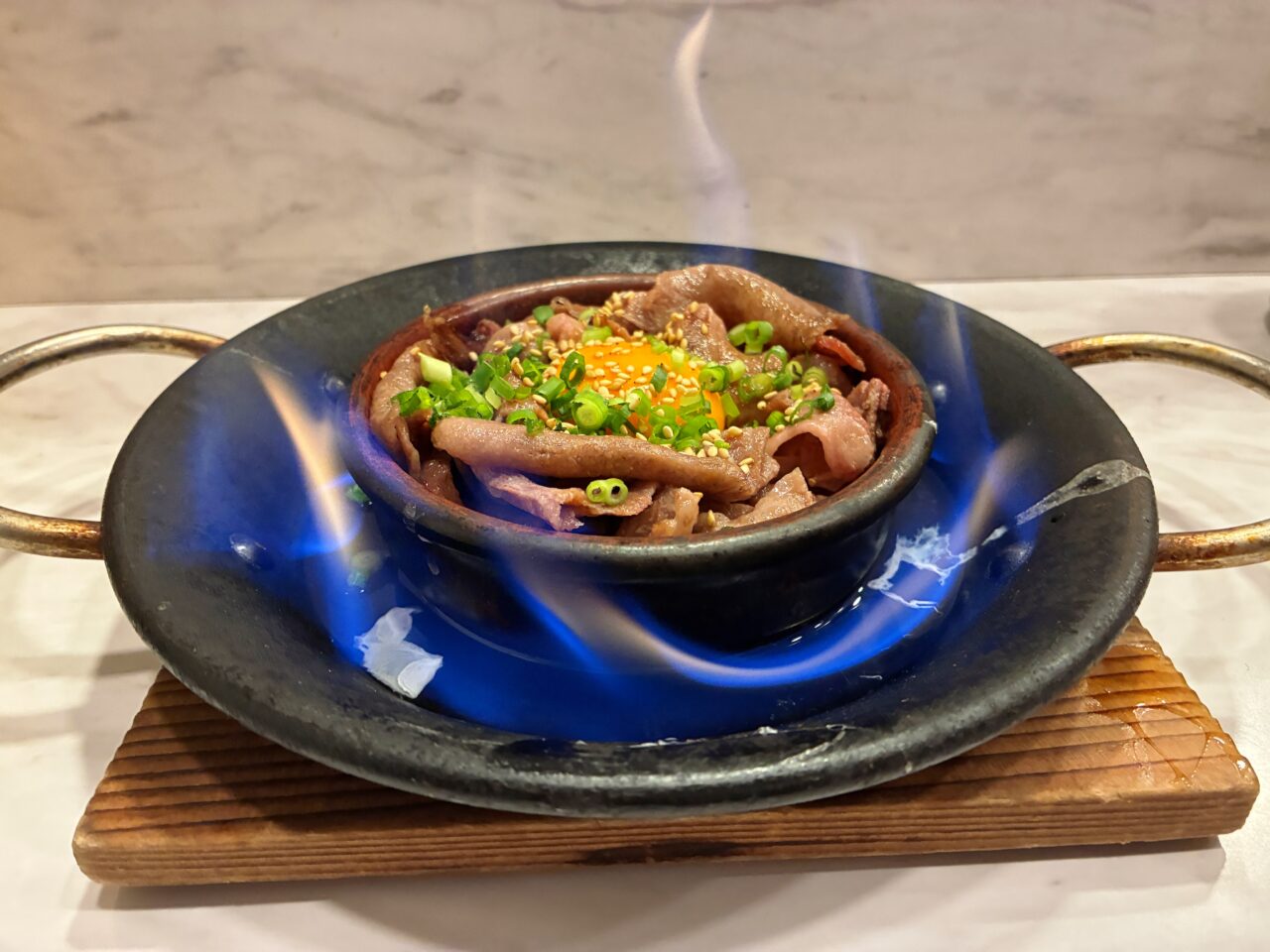 またもや料理名に惹かれて「燃えるユッケ」を注文。こちらは料理長考案のオリジナルメニューなんだとか♪提供時には、なんと本当に炎を上げながら登場!