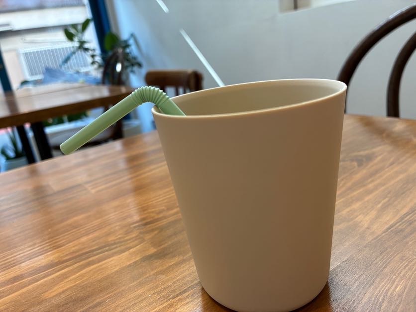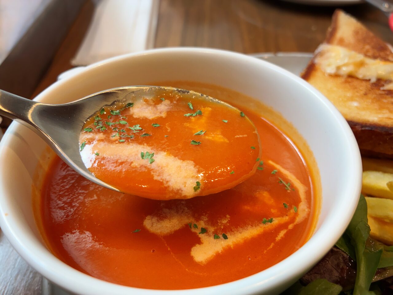 今回は「グリルドチーズサンドイッチとキムチトマトスープ(フライドポテトとサラダ付き)」をいただきました!平日はドリンクもセットに。今回は子連れということもあり、ドリンクは「アップルジュース」をいただきました。子ども用にプラスチックのコップに短いストローを添えて提供してくださり、細やかな気配りが嬉しい限り。