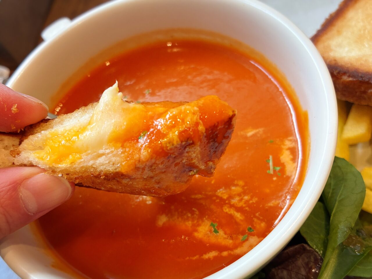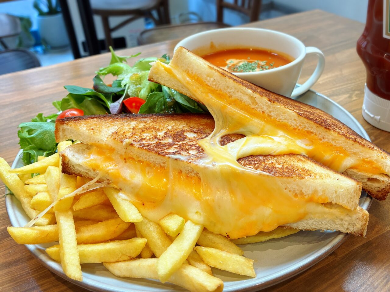 「グリルドチーズサンドイッチとキムチトマトスープ(フライドポテトとサラダ付き)」は全部が一皿にのり、とっても豪華です!