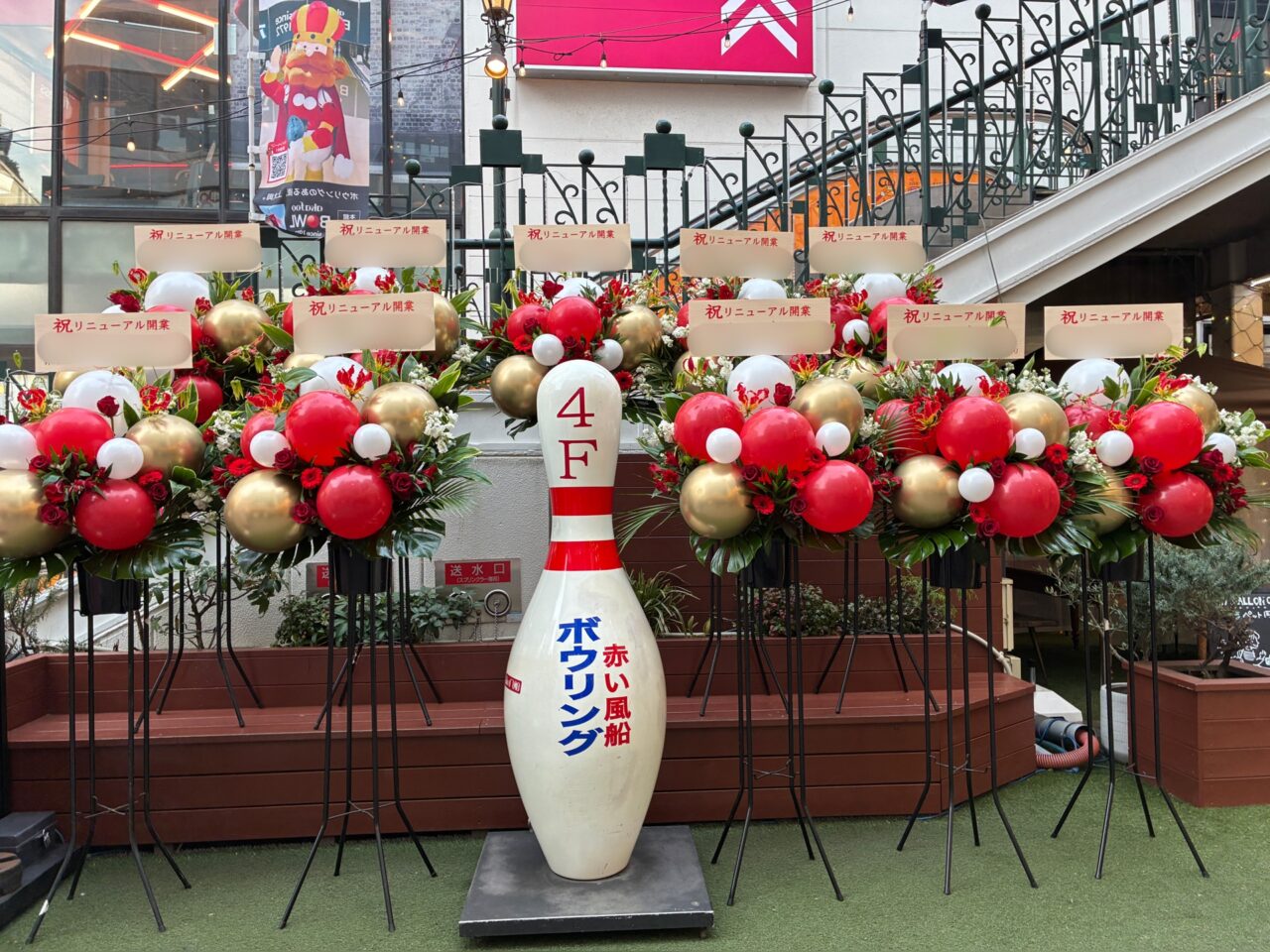 ボウリングの球と赤い風船をイメージした開店花がお出迎え!