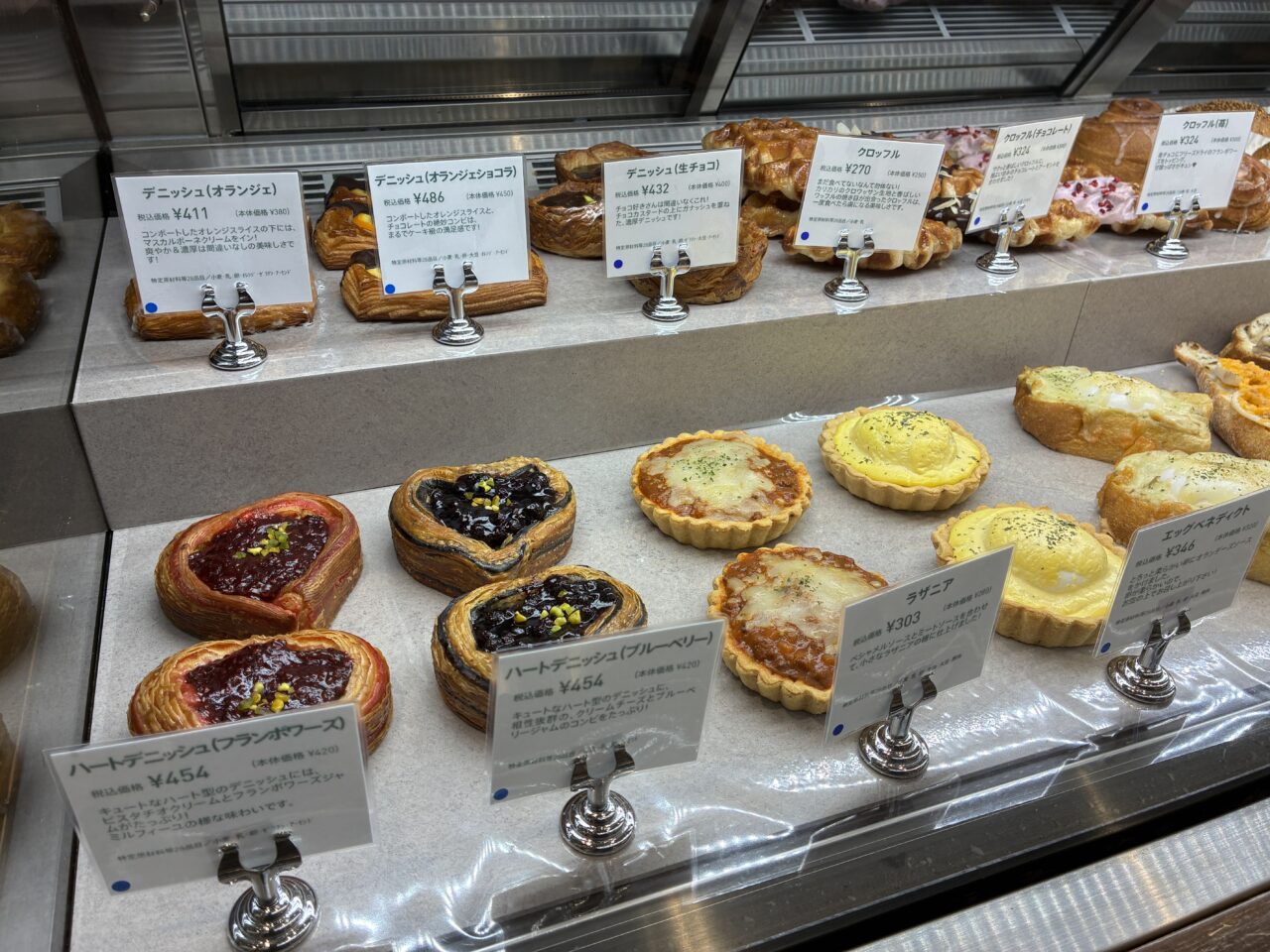 ショーケースの中にも色とりどりのパンが!インスタグラムでも紹介されている可愛らしいハート型の「ハートデニッシュ(フランボワーズ)」やタルト生地に、トロッと柔らかい半熟卵をのせて、オランデーズソースをかけた、「エッグベネディクト」等も発見!