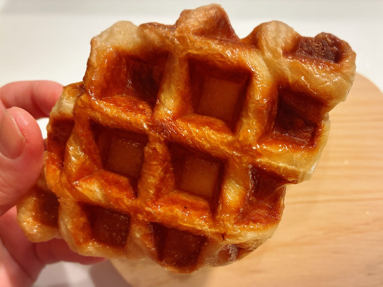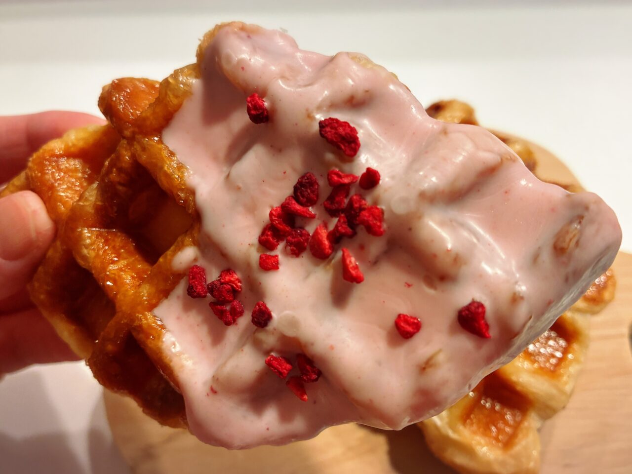 サクサクのクロワッサン生地と香ばしいワッフルの焼き目が出会った、新感覚フード「クロッフル」も!3種類の小麦粉と発酵バターを丁寧に折り込んだ生地を、砂糖をまぶしてプレスしているんだとか。プレーン味だけではなく、新商品の苺味とチョコレート味も店頭に並んでいました♪
