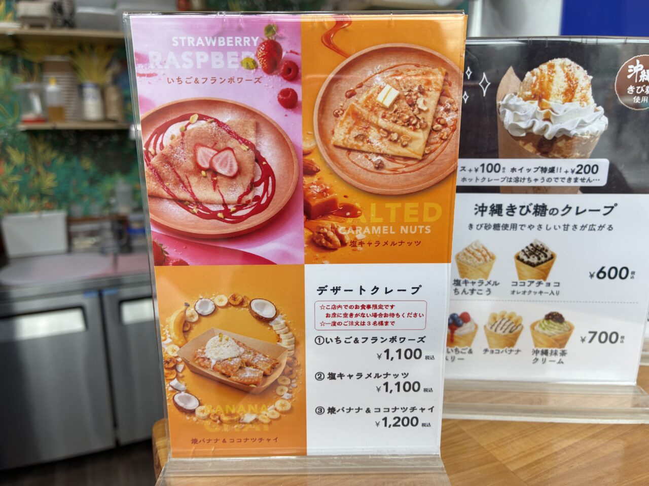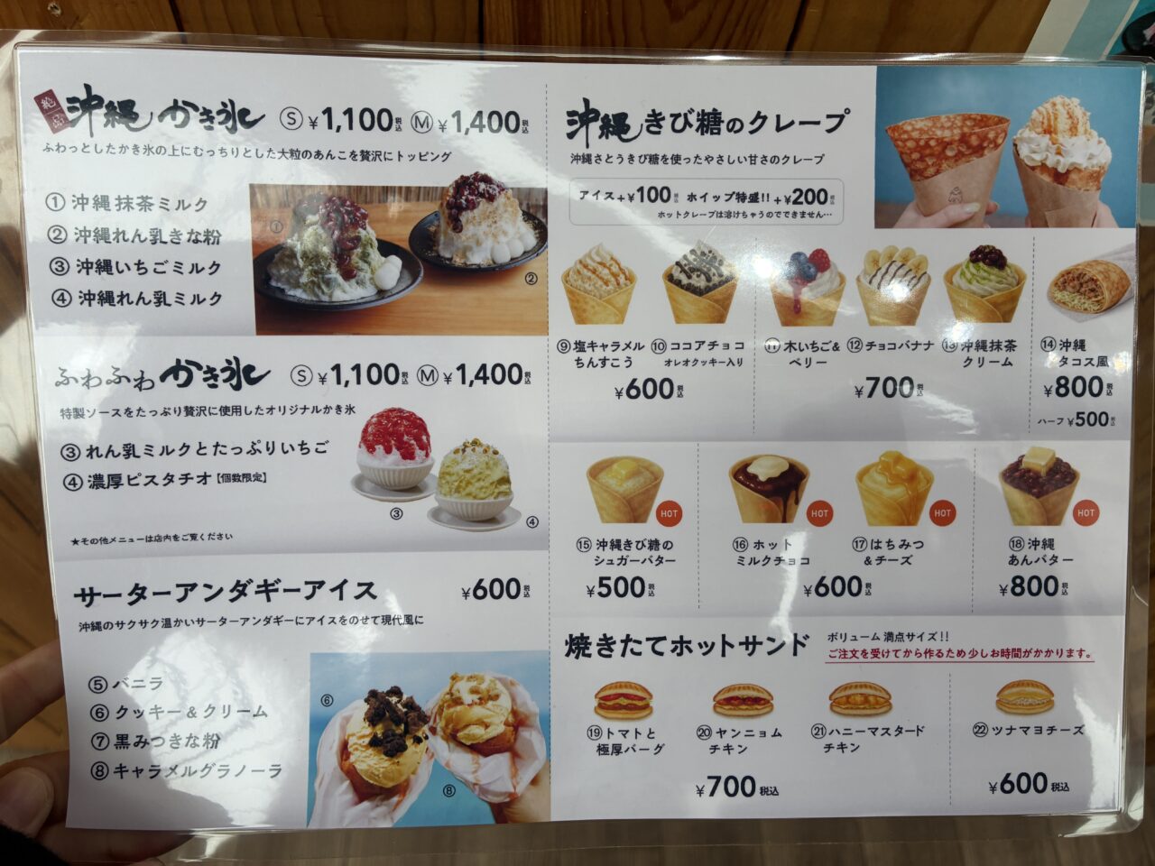 「沖縄かき氷」は、ふわっと軽やかな氷の上に、むっちりとした大粒の金時豆あんこを贅沢にトッピングした、お店の看板メニュー!そして今回は、前回伺ったときにはなかった、冬限定の「沖縄きび糖のクレープ」メニューもずらりと並んでいました。