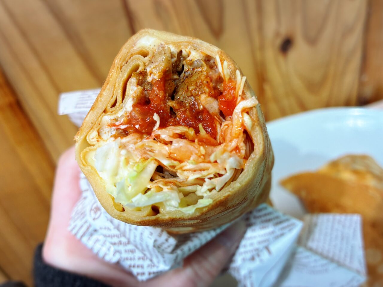スパイシーな具材とシャキシャキ野菜をやさしく包み込み、タコスのような味わいを楽しめる一品。7つのスパイスをブレンドした具材は香り高く、ほどよいピリ辛で病みつきになる美味しさ。さらに、沖縄きび糖を使用したクレープ生地のほんのりとした甘さが絶妙なアクセントとなり、ピリ辛の刺激をやさしく包み込んでくれていました。甘さと辛さのバランスが心地よい。結構ボリュームがあり、お腹いっぱいに!お昼時にまたリピートしたい美味しい一品でした。
