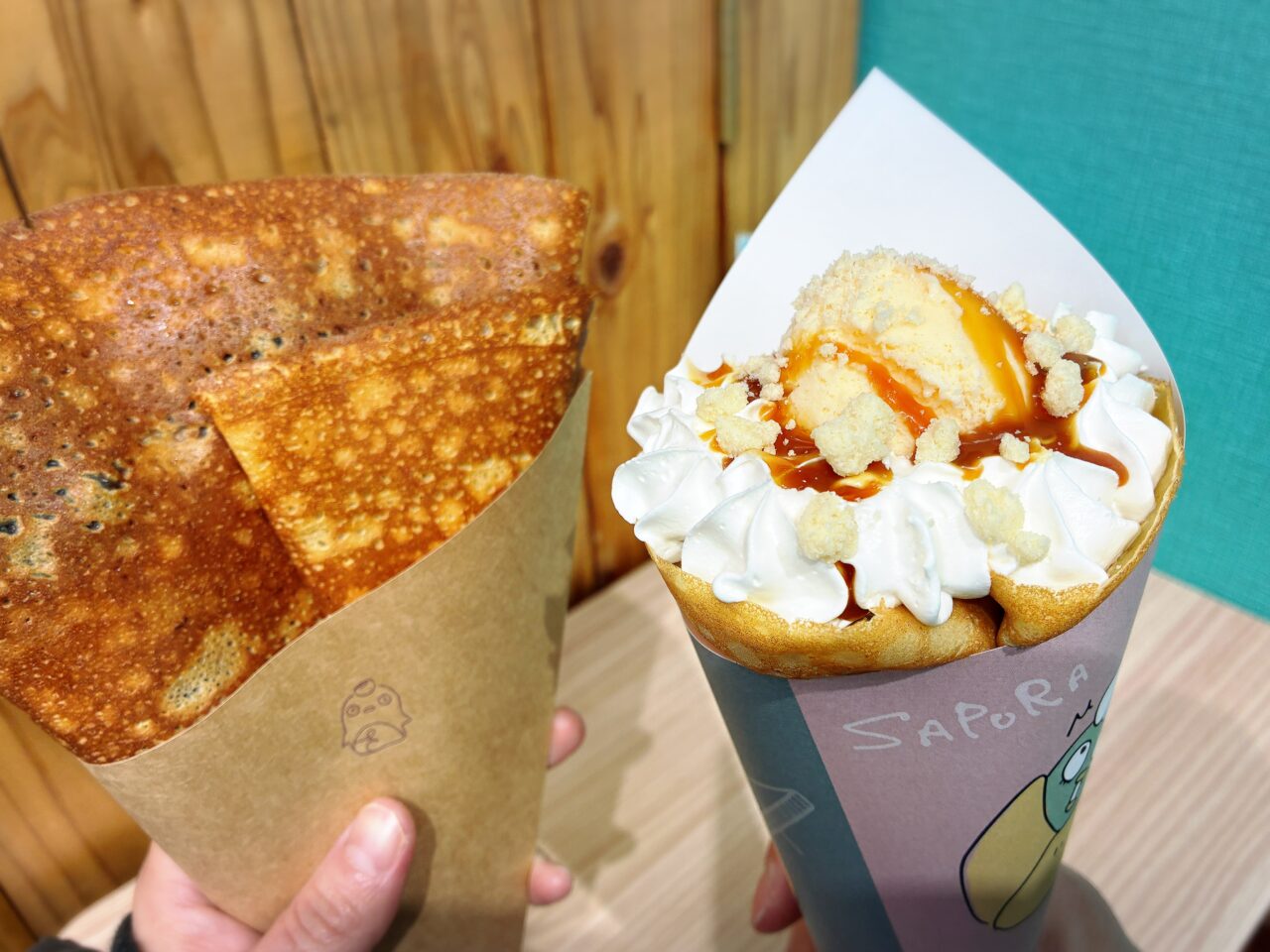 とっても美味しそうなクレープ!巻き紙には、お店のキャラクターの「サプラ」が♪とっても可愛いです◎