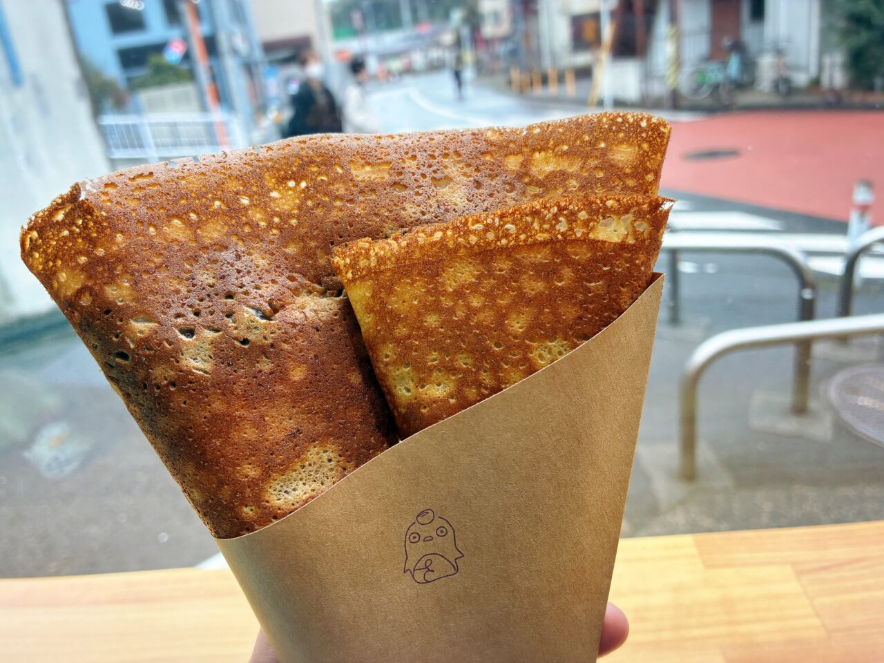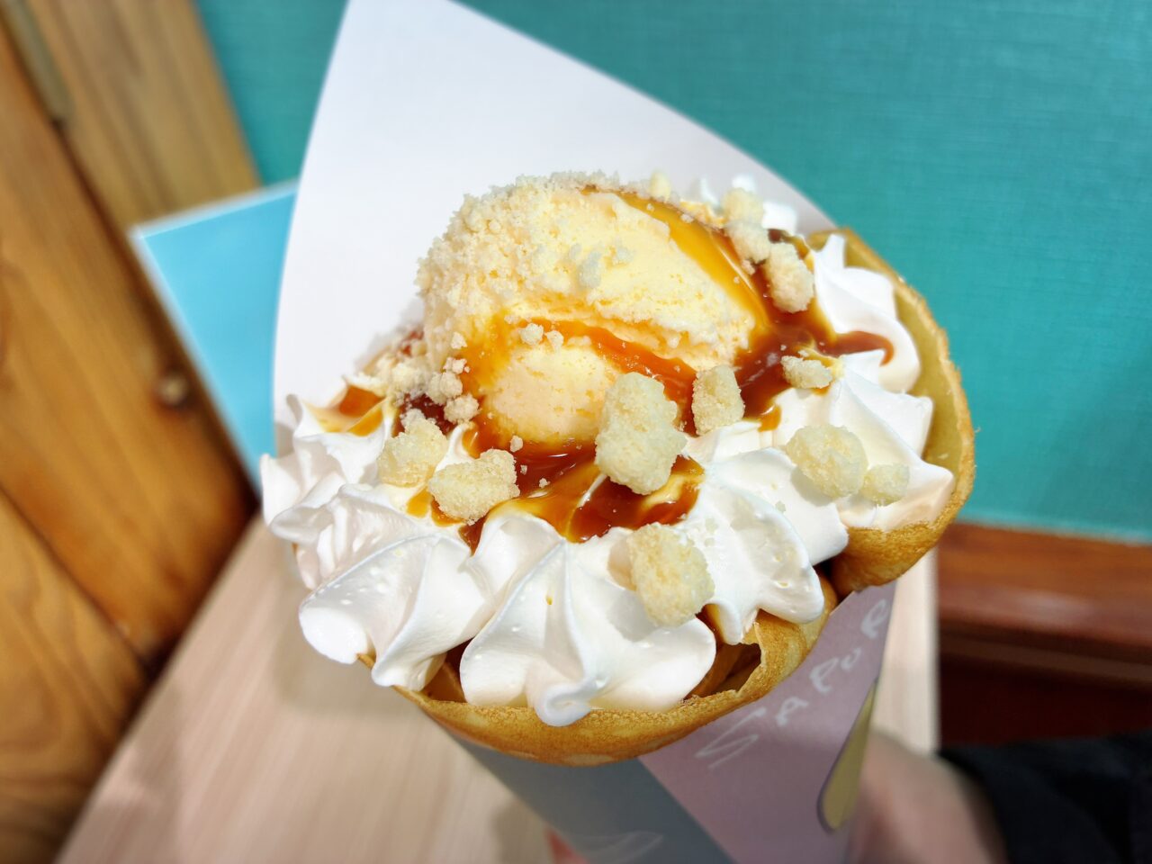 甘じょっぱい味わいがたまらない美味しさ!ざくざく食感のちんすこうに、とろ〜りキャラメルソース、ミルキーなホイップ、濃厚なアイス、そしてしっとり柔らかなクレープ生地。すべてが絶妙に重なり合い、まさに至福の一品です♪写真では伝わりにくいかもしれませんが、実はかなり大きめのクレープ生地に具材がぎっしり。見た目以上のボリュームで、大満足のひとときでした。