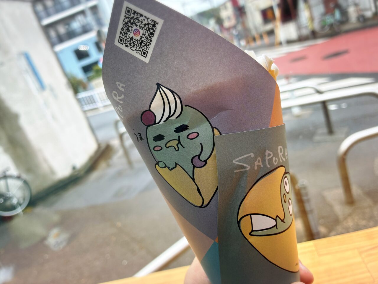 クレープの包み紙には「さぷら」の漫画が描かれていて、キャラクターの「さぷら」がクレープとして完成するまでの物語がストーリー仕立てで展開されています。思わず読みたくなる、ほっこり可愛い演出です。