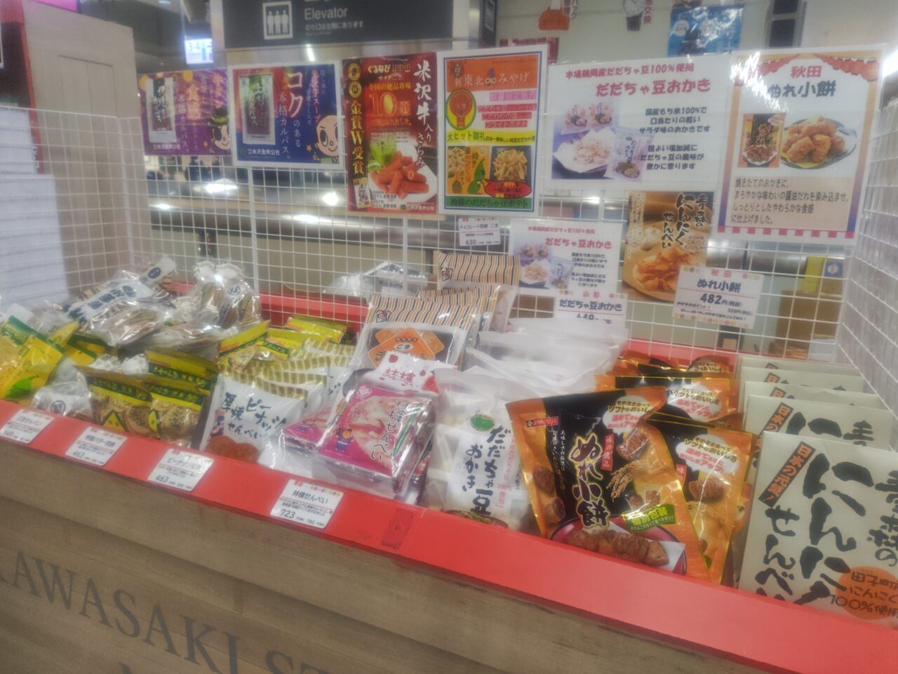 にんにくせんべい、秋田ぬれ小餅、ただ茶豆おかき、米沢牛入さらみ、林檎せんべいなどのおつまみ系やさっぱりとした東北せんべいもありました。