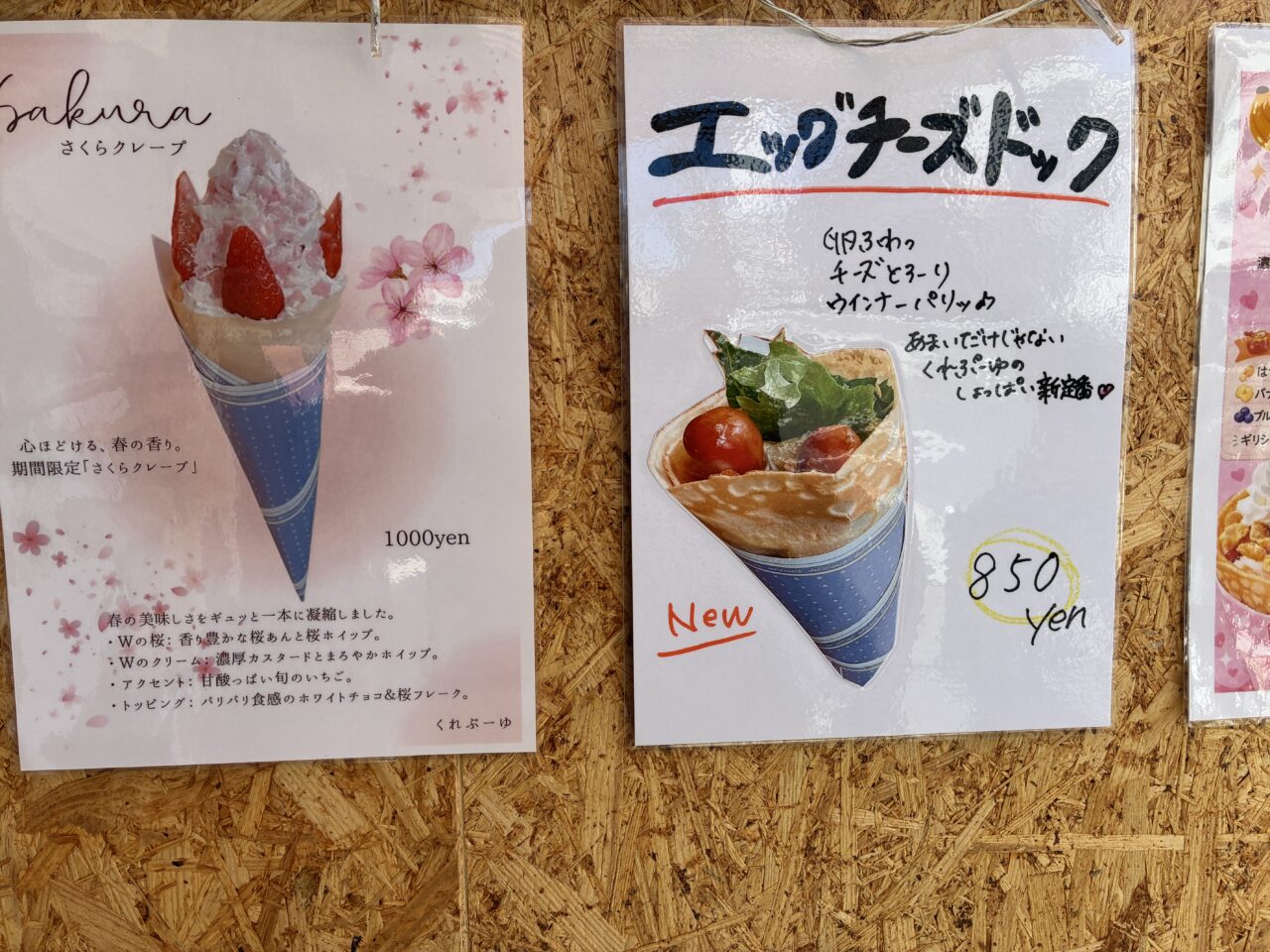 期間限定の「さくらクレープ」や新商品の「エッグチーズドッグ」は、豪華な写真入りで案内されていて、思わず目を奪われます。
