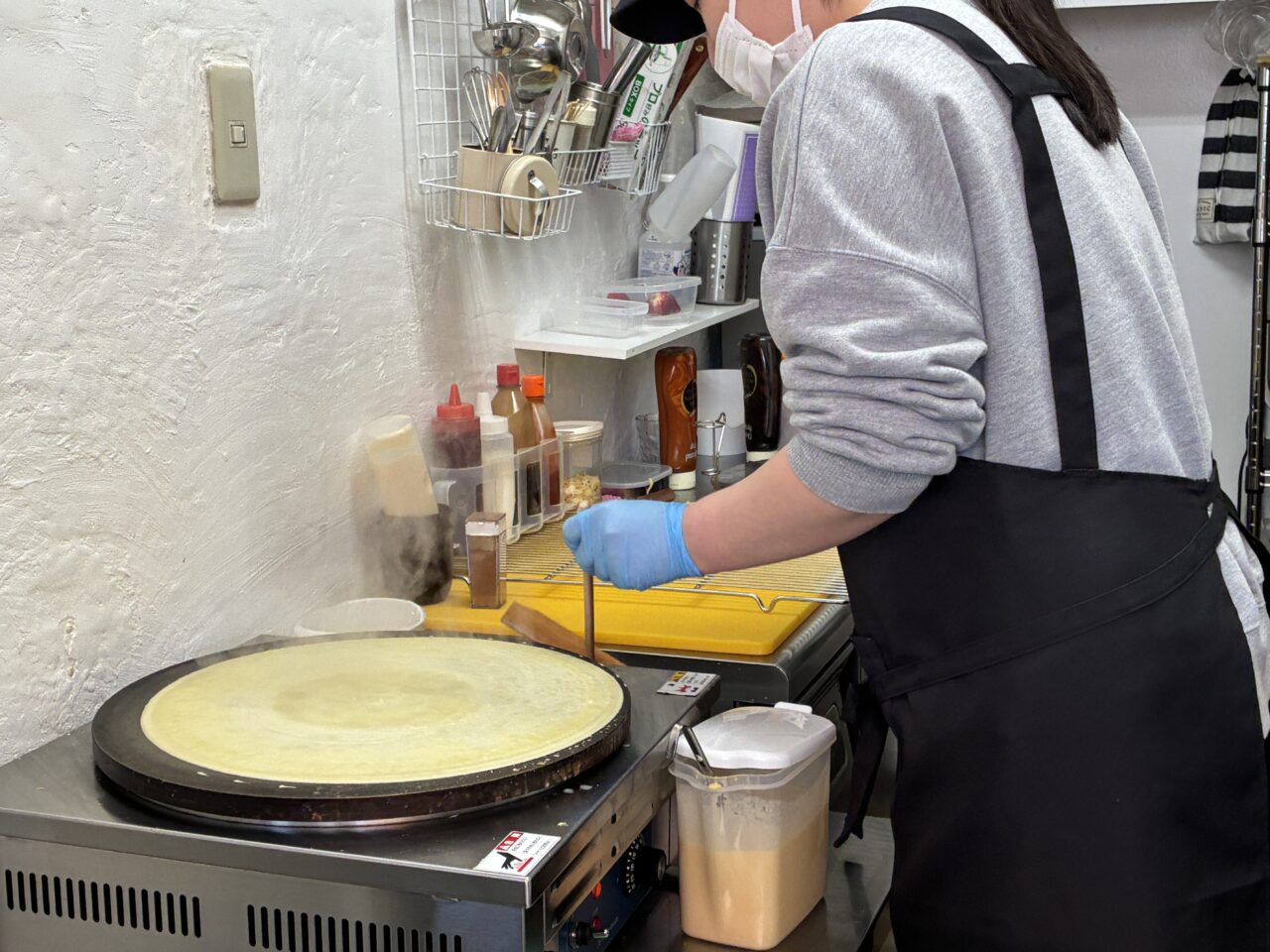 注文すると早速調理開始!小窓からクレープを丁寧に焼き上げる様子を見ることができ、ライブ感もたまりません。ふわっと広がる甘い香りに、出来上がりへの期待も高まります◎