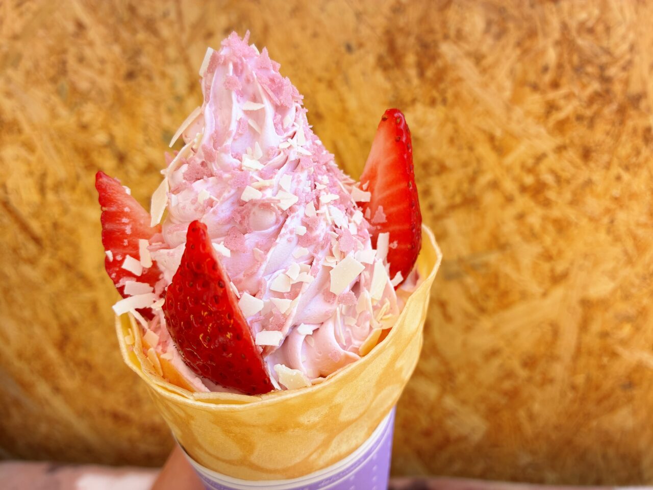 「さくらクレープ」は、まずそのボリュームに驚き!北海道産小麦粉100%のもちもち生地の中には、香り豊かな桜あんに桜ホイップ、濃厚カスタードとまろやかなホイップがたっぷり。さらにトッピングには、甘酸っぱい生いちごとパリパリ食感のホワイトチョコ、桜フレークが添えられた贅沢な一品です。
