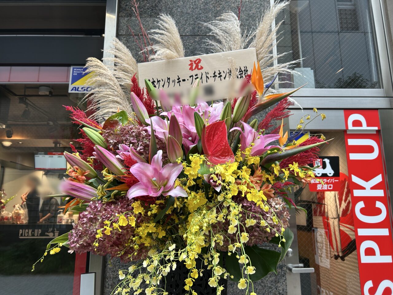 大きな看板が設置され、とても綺麗な外観です。お店の外や店内には、たくさんのお祝いのお花が飾られていました。